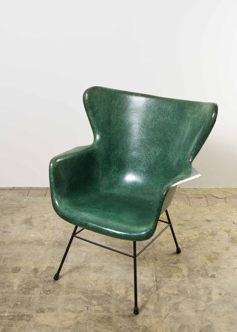 1958年にLawrence Peabodyがデザインしたウィングバックファイバーグラスチェア。この作品は広く普及していたイームズシェルチェアと遊び心に満ちたアメリカのアトミックエイジモダニズムを通して洗練された現代的な要素を備えています。単一のファイバーグラス製シェルとその魅力的な風合いが特徴で、そのシェルはスリムで鍛造されたアイアンフレームに包まれています。軽量かつ耐久性のある椅子のシェルはフレームにショックマウントされ、露出した背面、細い脚、床グライドを備えています。