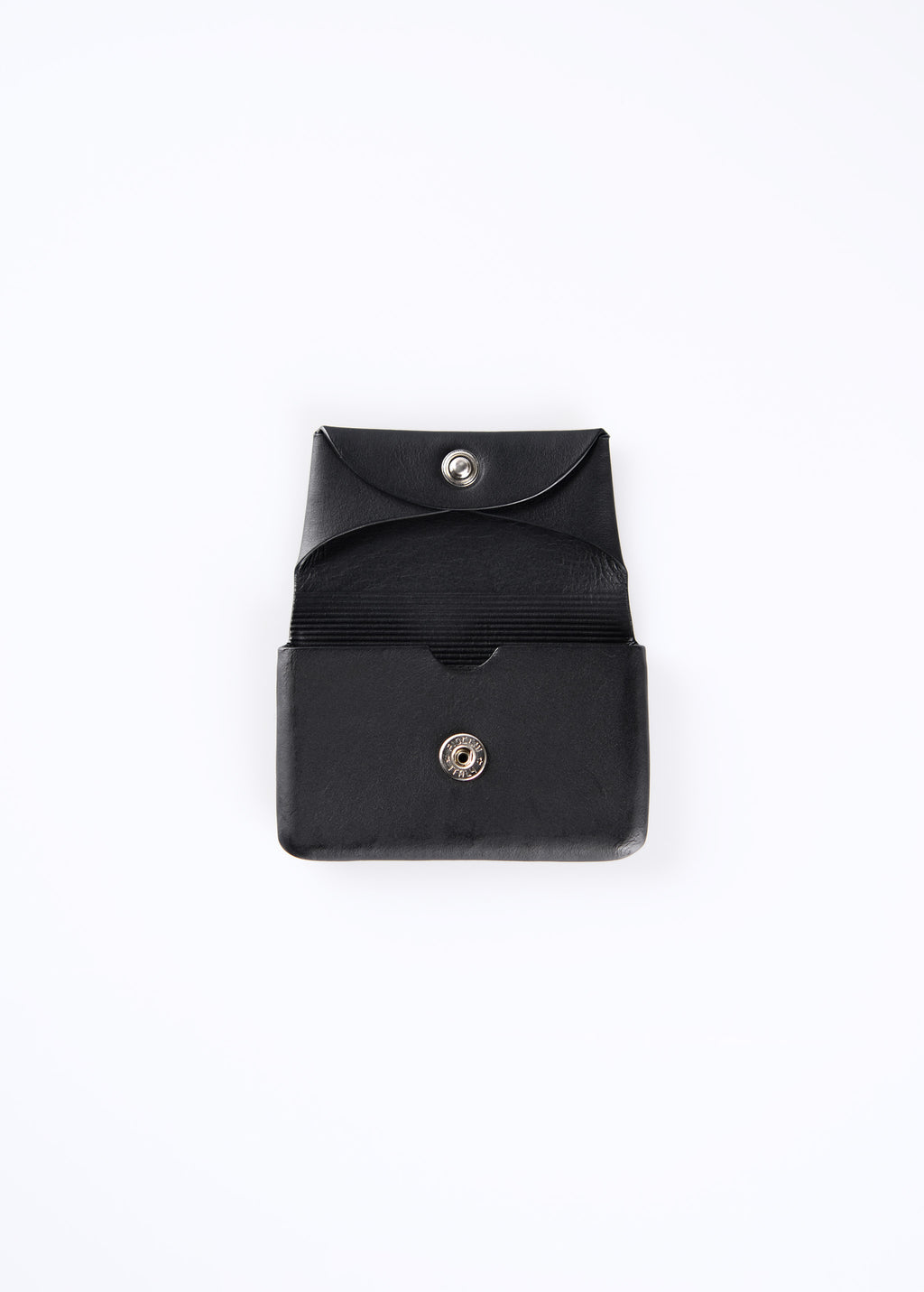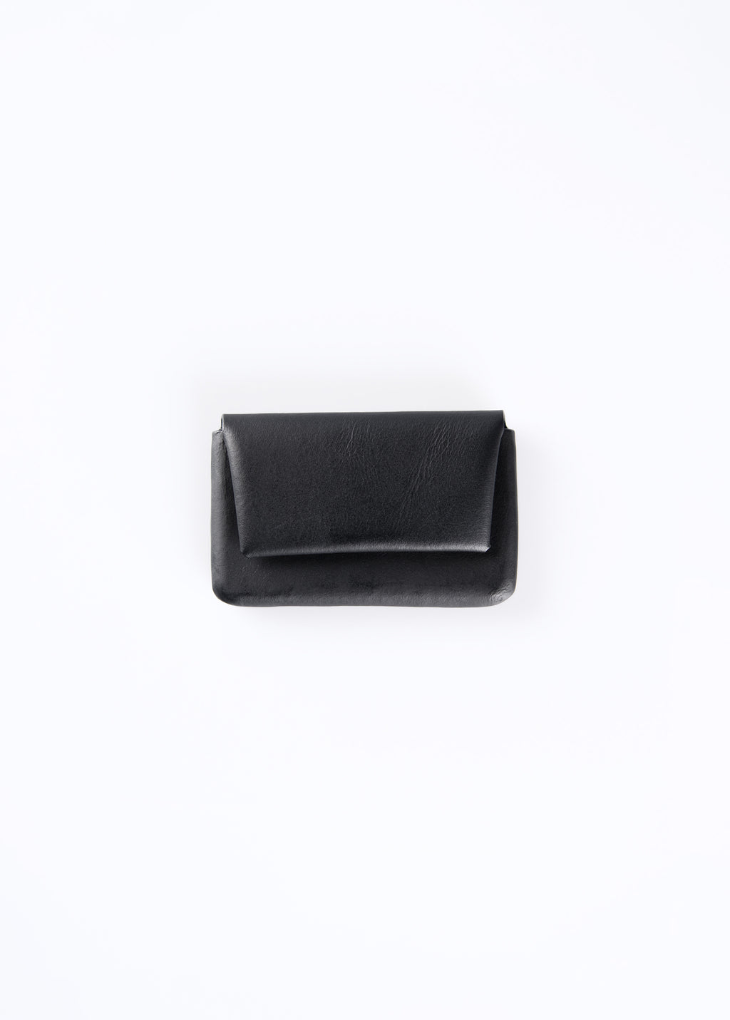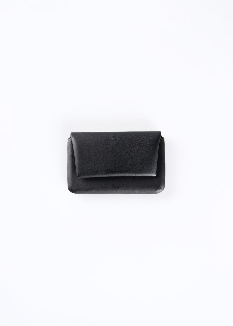 木型を使用し、革の可塑性を活かして立体的に成型する"絞り"技術を取り入れたシリーズです。木彫りから始まる工程は、熟練の技術と時間をかけて仕上げられています。収納部は革絞りで、被せは折り紙のように革を折り畳み、立体と平面の技法を融合させたデザインです。被せがコインの受け皿として機能し、視認性に優れています。