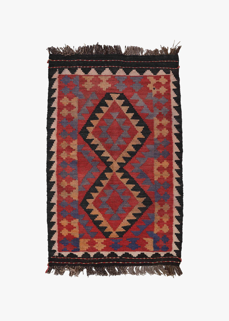 落ち着いた赤い色がベースとなり、シンプルな幾何学模様が印象的なヴィンテージラグです。年月を経て色が落ち着き、お部屋を高級な雰囲気に彩る逸品です。使い勝手の良いサイズで、玄関、キッチン、リビングの一角、店舗インテリアなど、どこに敷いても馴染みます。